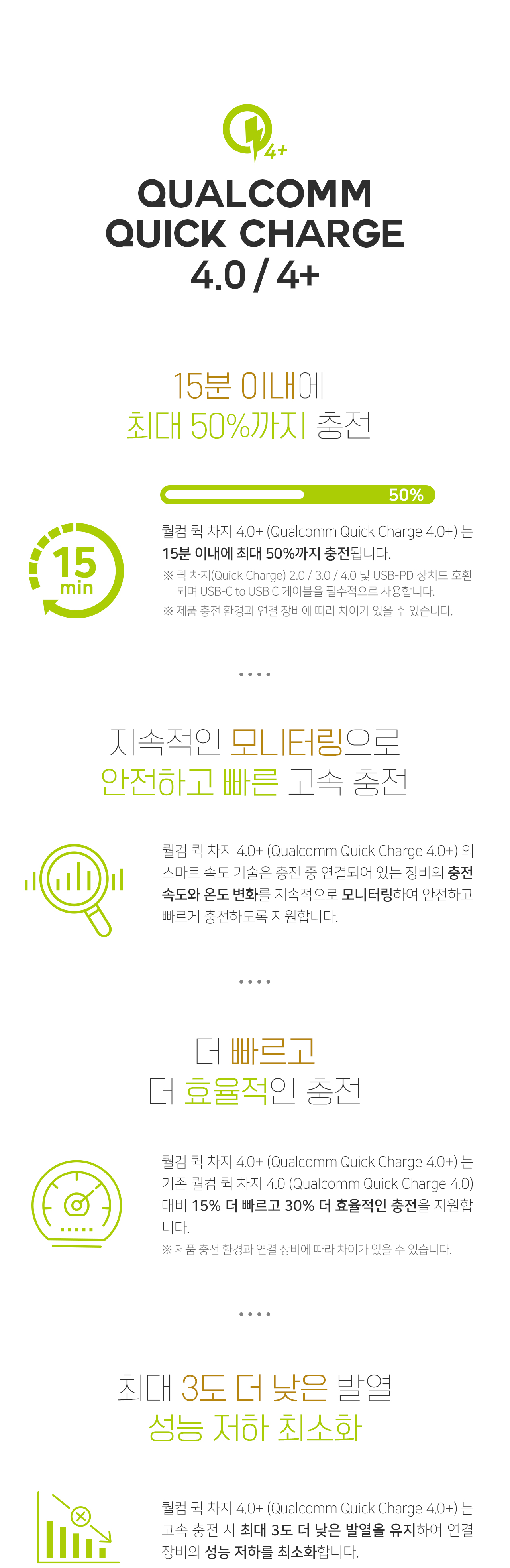 - 퀵 차지 4.0+는 기존 퀵 차지 4.0 대비 15%더 빠르고 30% 더 효율적인 충전을 지원합니다.
